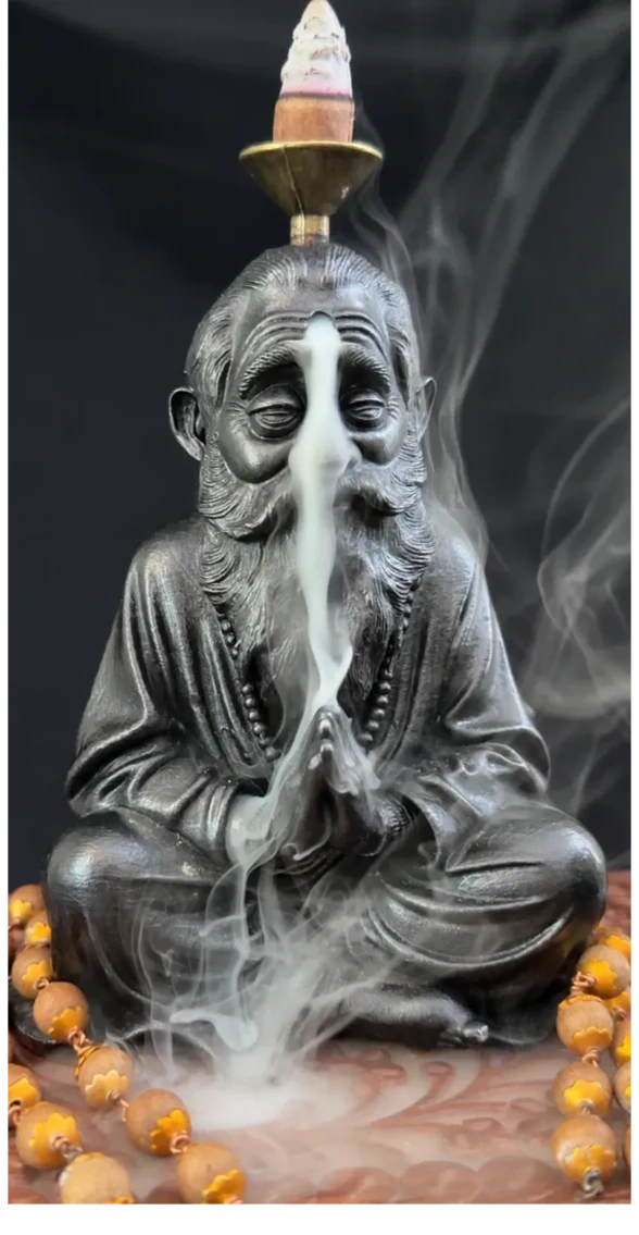 Place a backflow incense cone in the holder, light and wait for the smoke to pour from his 'third eye'.